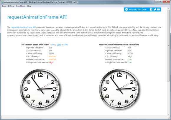 Browsers need amazing performance to deliver on the promise of HTML5 applications. Web developers need API’s to efficiently take advantage of modern PC hardware through HTML5 and build high performance Web applications with efficient power use for great, all around customer experiences. The second IE10 Platform Preview supports three emerging API’s from the W3C Web Performance Working Group which enable developers to make the most of the underlying hardware and use battery power more efficiently: requestAnimationFrame, Page Visibility and setImmediate.