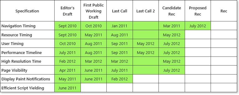 As of this month, User Timing, Performance Timeline and Page Visibility specifications have been published as a Candidate Recommendation (CR). This stage of standardization is prior to the PR stage and reflects that the W3C believes this specification has been widely reviewed and satisfies the Working Group’s technical requirements. Resource Timing was published as CR just two months ago, along with High Resolution Time, which went from an Editor’s Draft to CR in just three months.